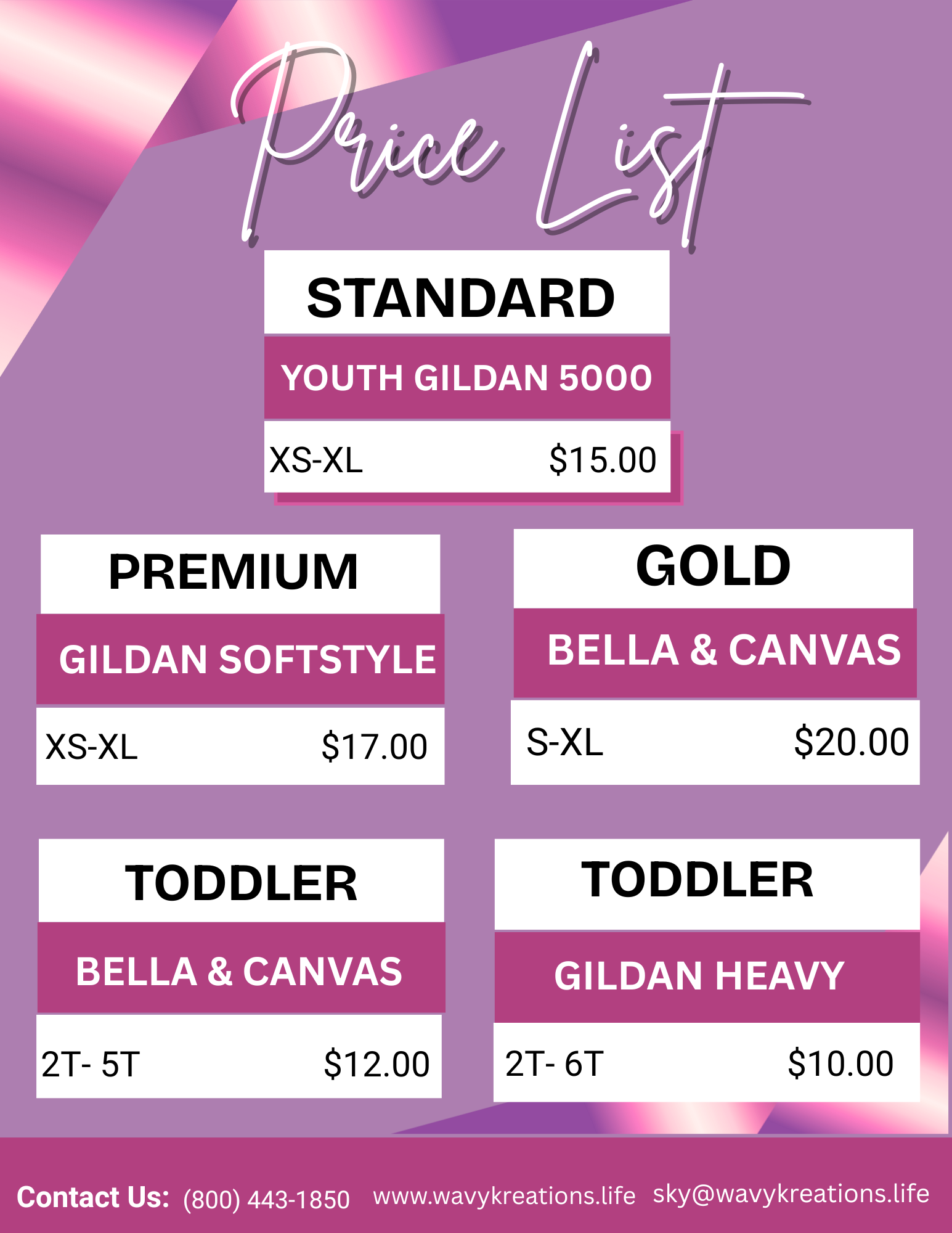 Welcome to WavyKreations — where passion meets purpose! I'm Thania, the founder and creative force behind this brand. Established in 2024, WavyKreations was born from a desire to bring unique, custom-made apparel and merchandise to life while empowering others through creativity and community engagement. From Custom T-Shirts, Sweatshirts, Hats and more, our mission is to help you express your vision through quality and style. At WavyKreations, we proudly serve Churches, Schools, Non-Profit Organizations, and all types of businesses with designs that speak volumes. Whether it’s spirit wear, event tees, outreach merchandise, or custom gifts, we're here to bring your ideas to life with excellence and care. To begin any custom order, FULL PAYMENT IS REQUIRED. This secures your project and allows us to start crafting your unique pieces. If you have any questions, inquiries or concerns please feel free to CONTACT US, enter your information in the contact section below, and one of our customer service team members will gladly get back to you.