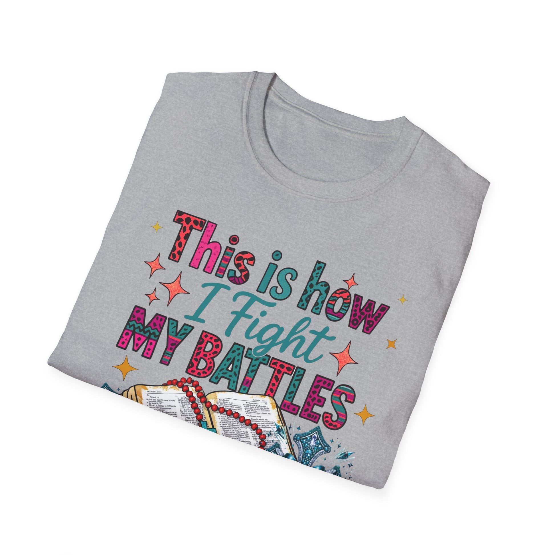 Stand strong in faith with this bold and beautifully detailed Christian T-shirt design that declares "This is how I fight my battles." Featuring a vivid open Bible, sparkling blue crosses, a red rosary with turquoise cross, and vibrant decorative text, this shirt is a stunning statement of spiritual strength and trust in God.