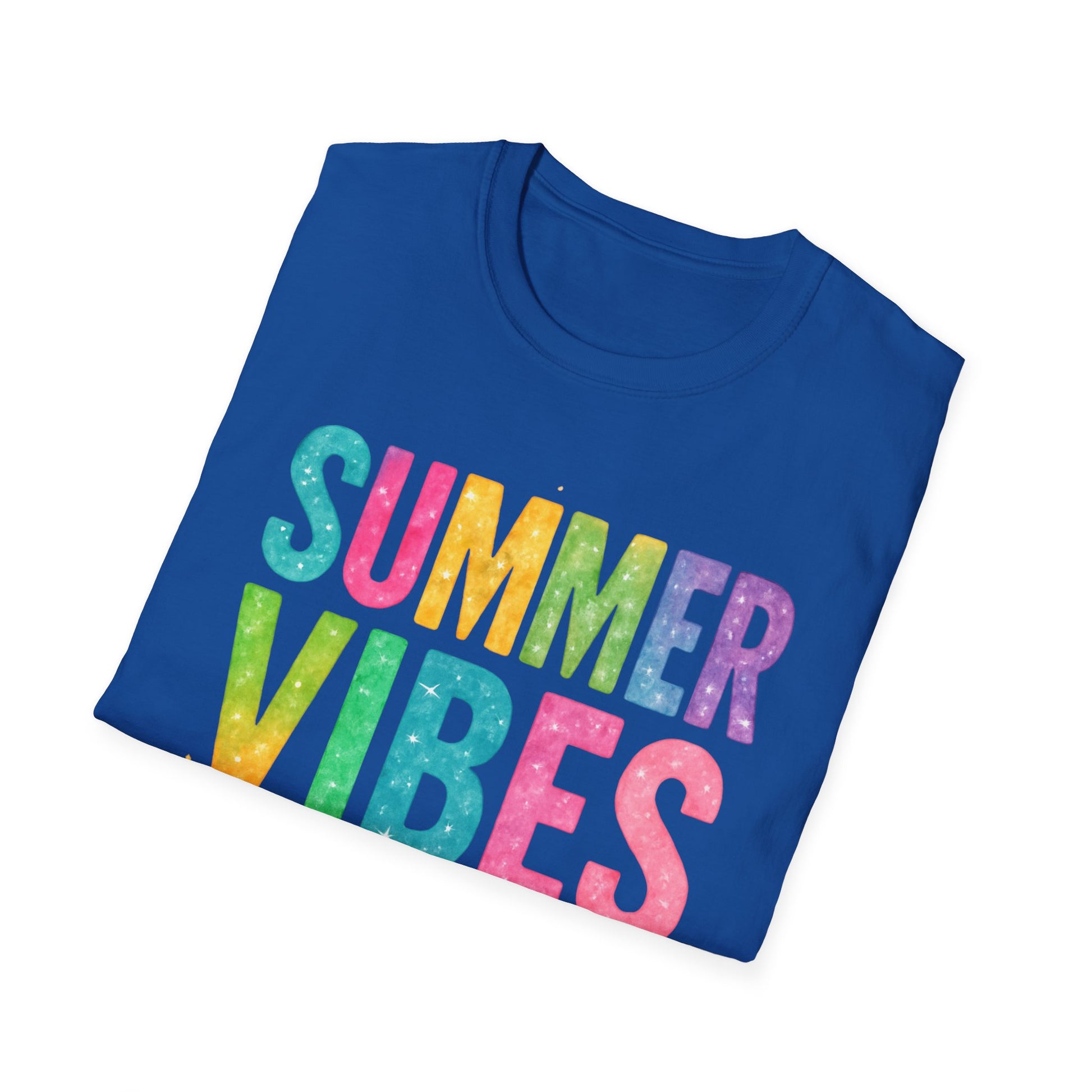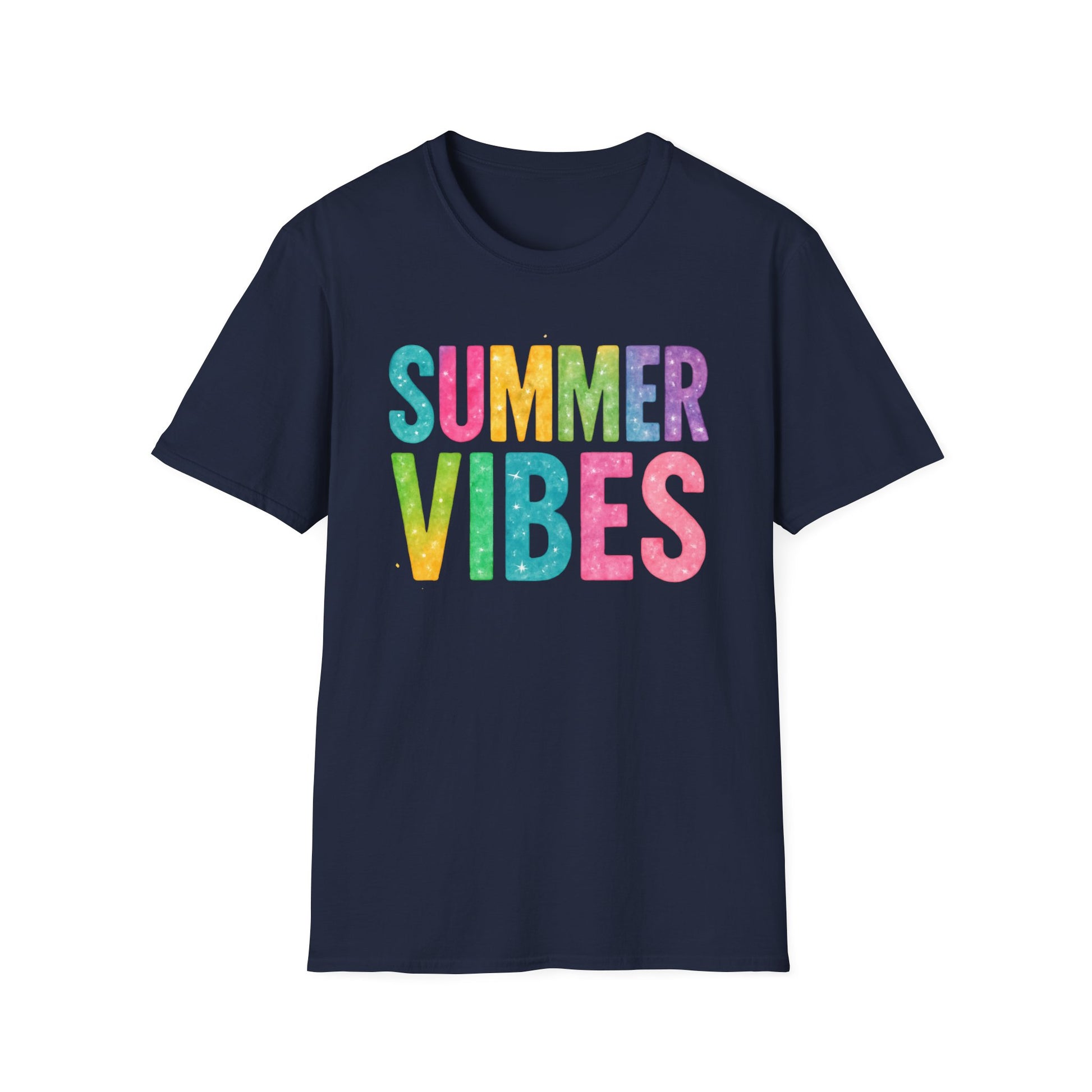 Bring the sunshine wherever you go with our "Summer Vibes" T-Shirt! This bold and cheerful design features rainbow watercolor letters with a splash of glitter-like sparkle