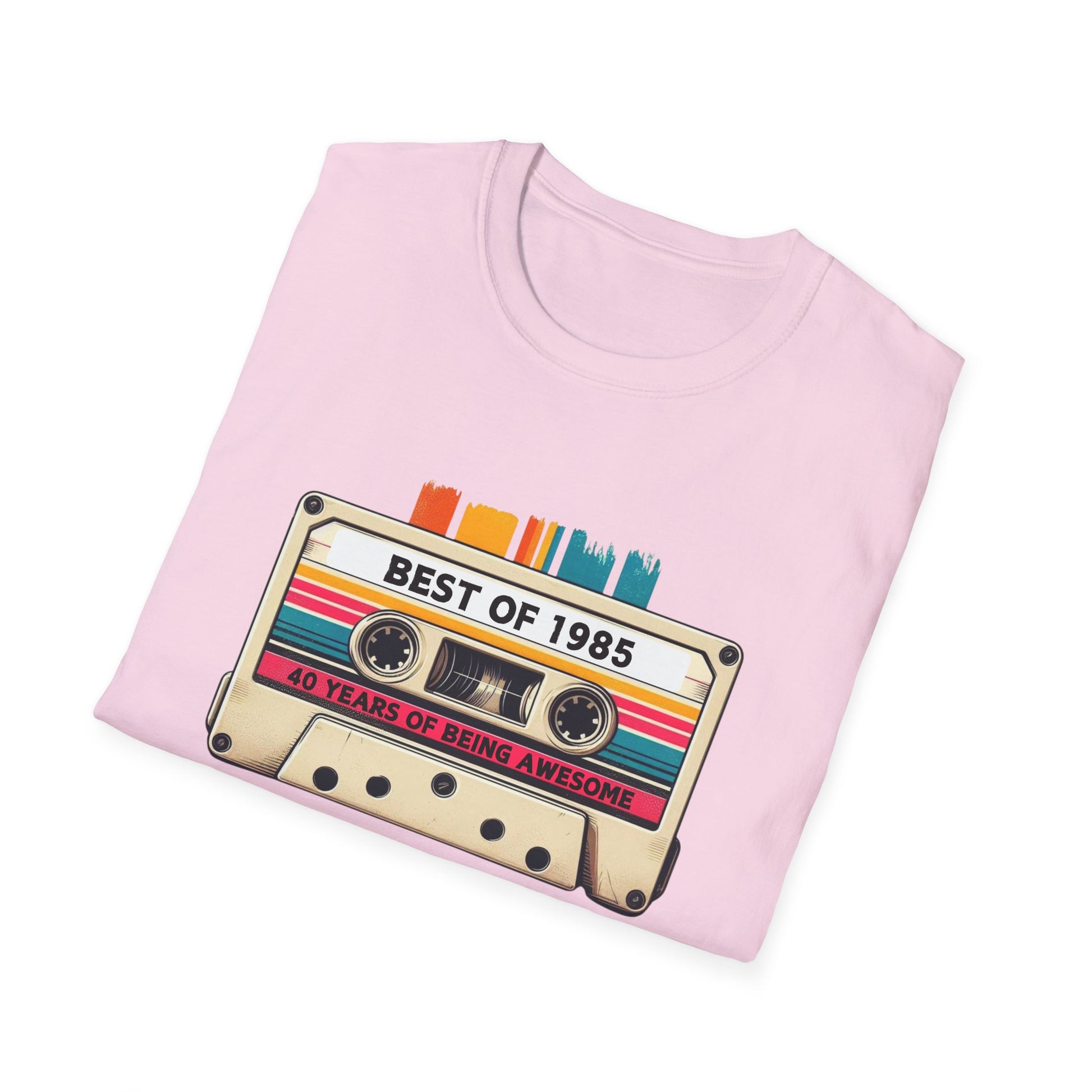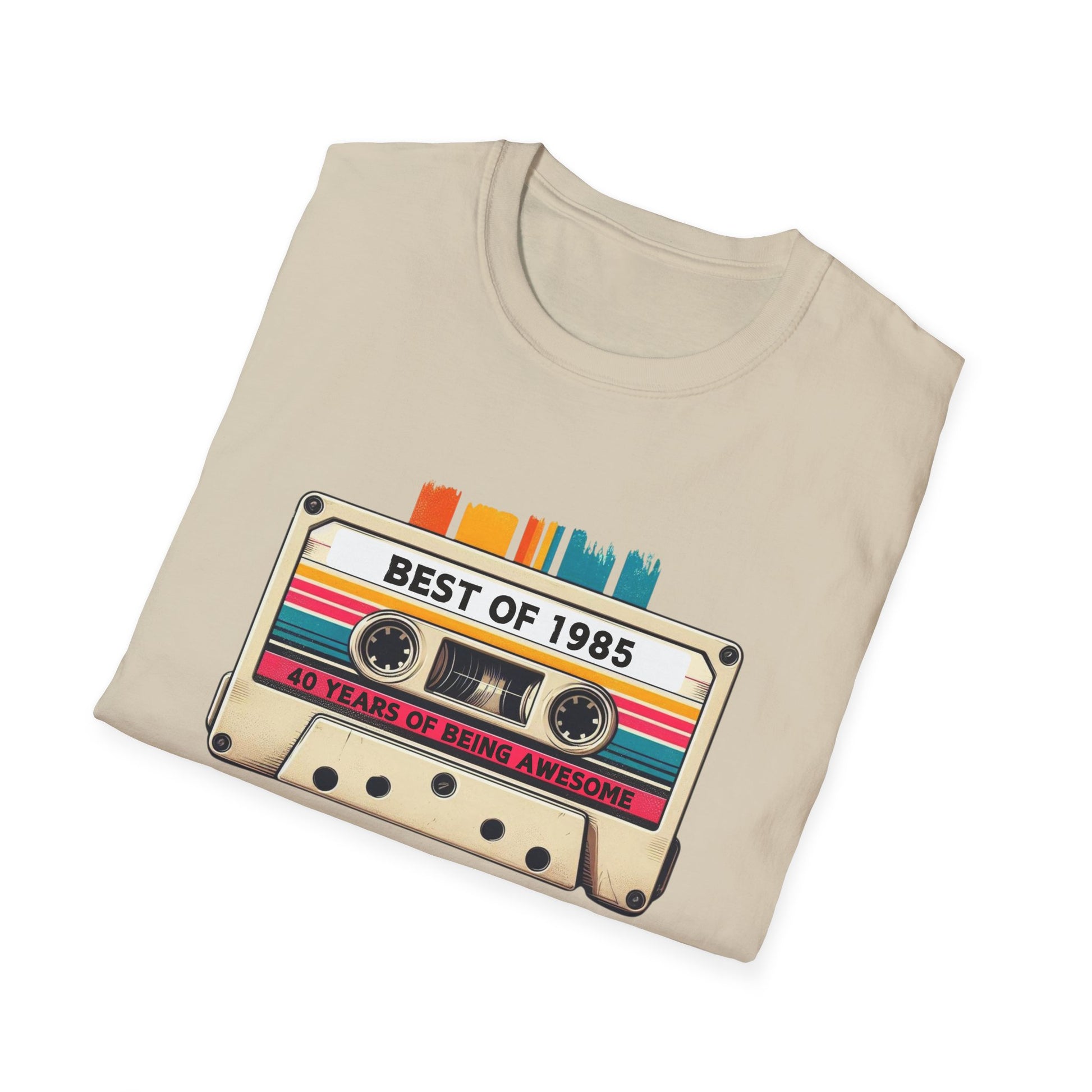Celebrate a milestone year with this nostalgic Unisex Softstyle T-Shirt featuring a retro cassette design that captures the essence of 1985. Perfect for music lovers and vintage enthusiasts, this tee adds a fun touch to any casual outfit. Lightweight and comfortable, it’s ideal for everyday wear, parties, or reunions. The soft fabric and classic fit make it an all-year favorite, allowing you to reminisce while enjoying stylish comfort. This t-shirt is perfect for birthdays, anniversaries, and throwback events, bringing a smile to friends and family alike.