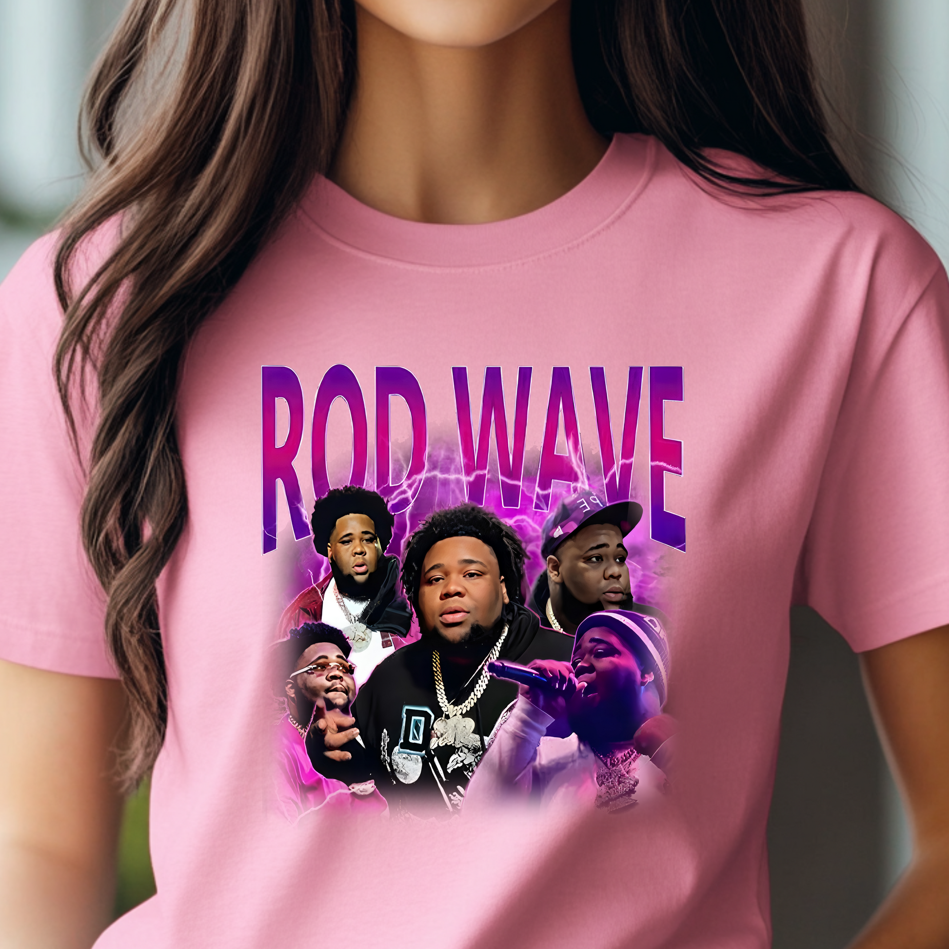 Show off your love for Rod Wave in this stylish pink tee featuring a dynamic collage of the artist surrounded by electric purple lightning. This fan-favorite design is a must-have for concert nights, fan events, or simply turning heads with bold streetwear energy. The perfect mix of soft cotton comfort and music-inspired style.